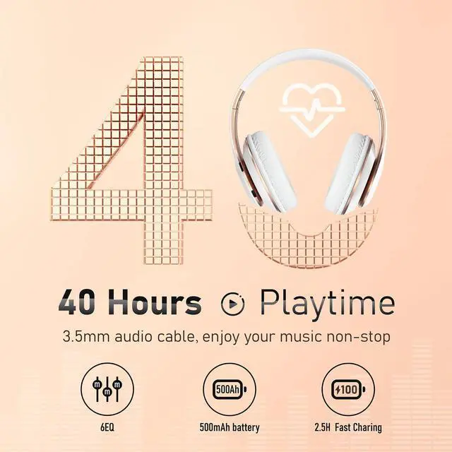 40 Hours Long Playtime with 6 EQ Modes - Our wireless headphones feature 6 EQ modes allowing you to switch freely between Bass/Jazz/Voice/Rock/Pop/Classic sounds, each providing CD quality audio. With a 500mAh battery, enjoy up to 40 hours of playtime and fast charging in just 2.5 hours. The headphones also come with a 3.5mm audio cable, enabling you to switch to wired mode and enjoy uninterrupted music.
