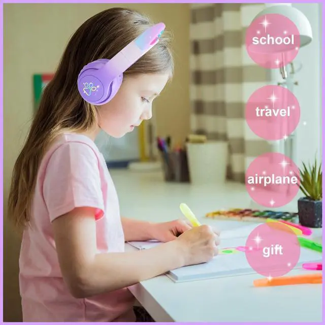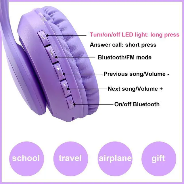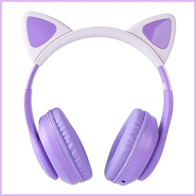 Lovely Kids Headphones with LED Cat EarThese kids bluetooth headphones feature adorable cat ears and RGB LED lights that dance and flash with the rhythm of the music, making them a stylish choice for girls. You can also press the "+" button twice to turn off the light and extend the usage time.