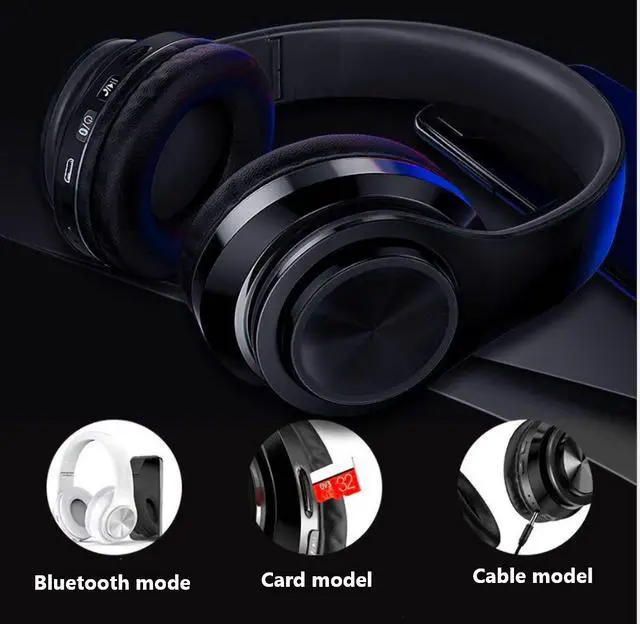 Three ways to connect devices: Bluetooth mode, cable mode, and TF card mode (headphones include AUX plugs for wired connections, and an AUX audio cable is provided).