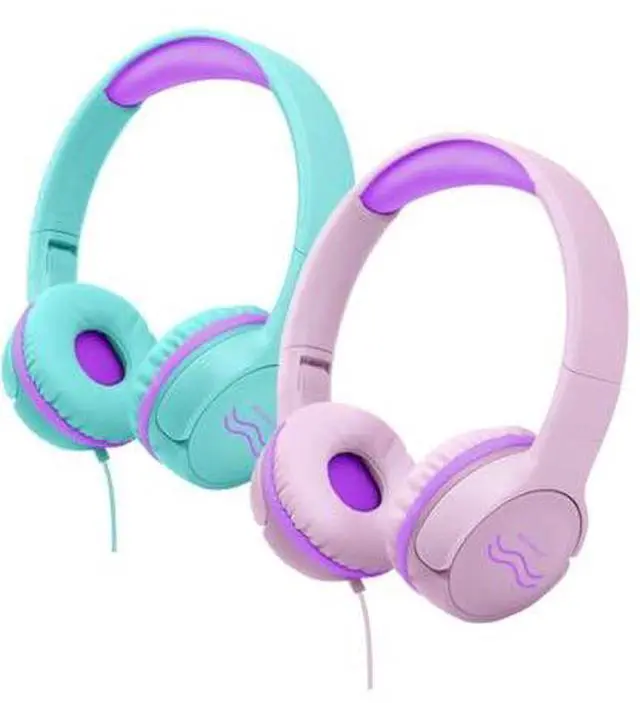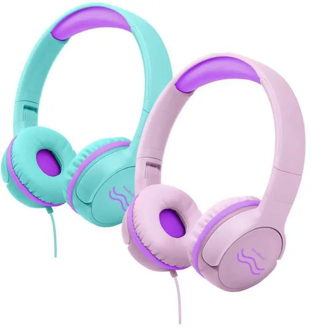 2 Pack Wired Headphones, Foldable, Volume Control Safe Listening(85/94dB), 3.5mm Jack on-Ear Headset for Children/Teens/Valentine's Day/School/Travel/Plane/Tablet/Laptop, Green Pink Purple