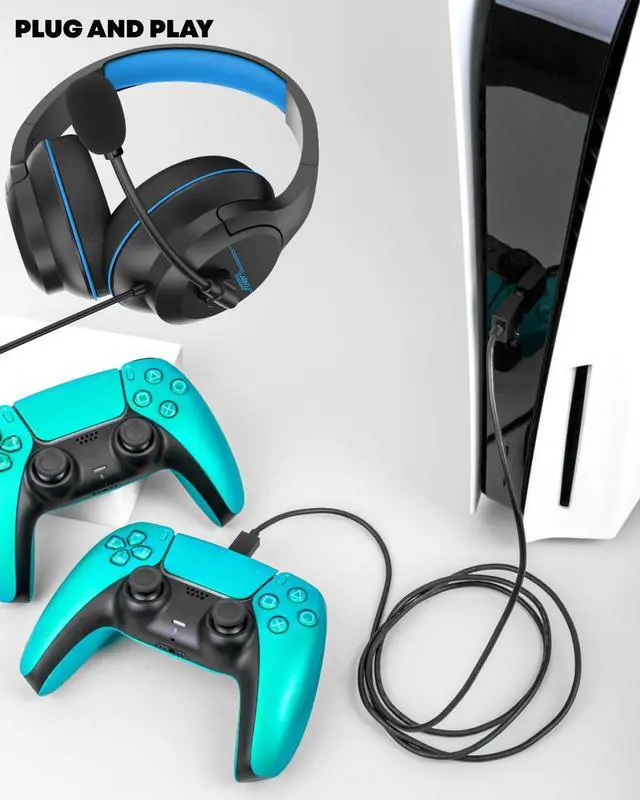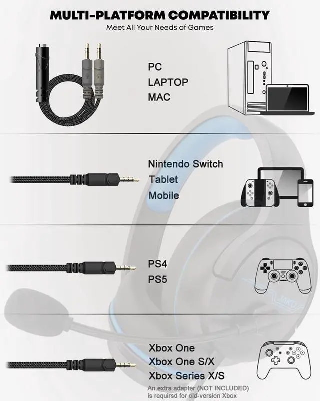 Compatible with All Gaming Platforms Plug and Play: These gaming headsets are compatible with various platforms, including PS5, PS4, PC, Xbox Series X/S, laptops, tablets, and cell phones. When using on a PC, an audio split cable is required. The headset features a 6.9-foot high-tension, tangle-resistant braided cable, ensuring convenience and preventing cable tangling with a 3.5mm jack, plug and play. The adjustable headband ensures a comfortable fit for various head sizes.