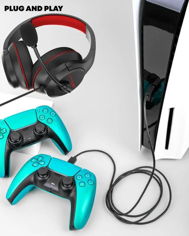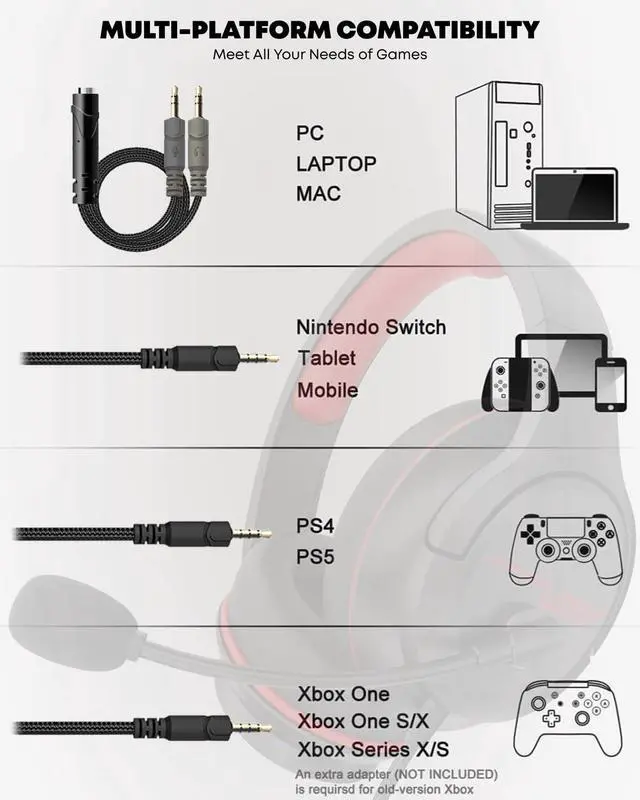 Compatible with All Gaming Platforms Plug and Play: The gaming headset is compatible with various platforms, including PS5, PS4, PC, Xbox Series X/S, laptops, tablets, and cell phones. When using it with a PC, an audio split cable is required. The headset features a 6.9-foot high-tension, tangle-resistant braided cable, ensuring convenience and preventing cable tangling with a 3.5mm jack, plug and play. The adjustable headband ensures a comfortable fit for various head sizes.