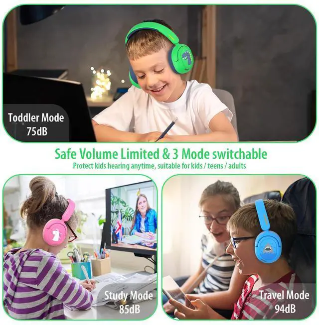 Safe Volume Limited 75/85/94dB - Wireless kids headphones protect young ears with volume control; designed to meet strict kids market regulations, these headphones feature volume-limiting technology of 75/85/94dB to safeguard kids' delicate hearing, preventing long-term damage from excessive noise. Perfect for school, travel, or home use.