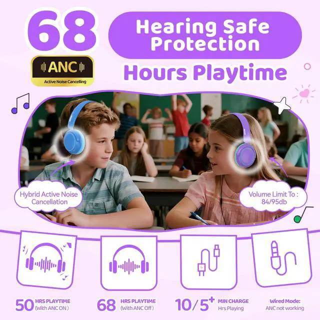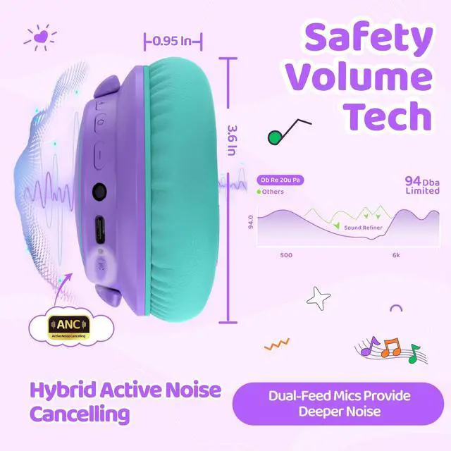 2-Stage Volume Limit + ANC: Features 85/94dB volume limits for hearing protection. Light Active Noise Cancelling helps kids concentrate without discomfort. One-button DB switch for different ages; 94dB requires parent supervision.