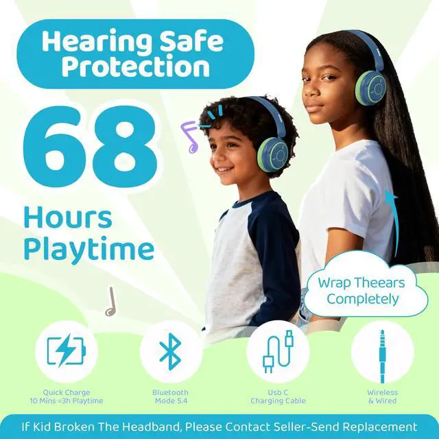Kids Headphones Bluetooth 5.4 Wireless Volume Limited 85/94dB Hearing Protection Over Ear 68 Hours Playtime Foldable Lightweight Headset Built-in Mic for Toddler Child Travel School Green Blue