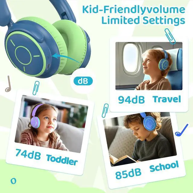 Volume Protection - Children's headphones feature three-stage safe volume settings at 74/85/94dB to protect hearing health: 74dB mode is suitable for ages 3-6, 85dB is ideal for school-age children, and 94dB requires parental supervision (press and hold for 2 seconds to switch); combination key lock to prevent accidental touch.