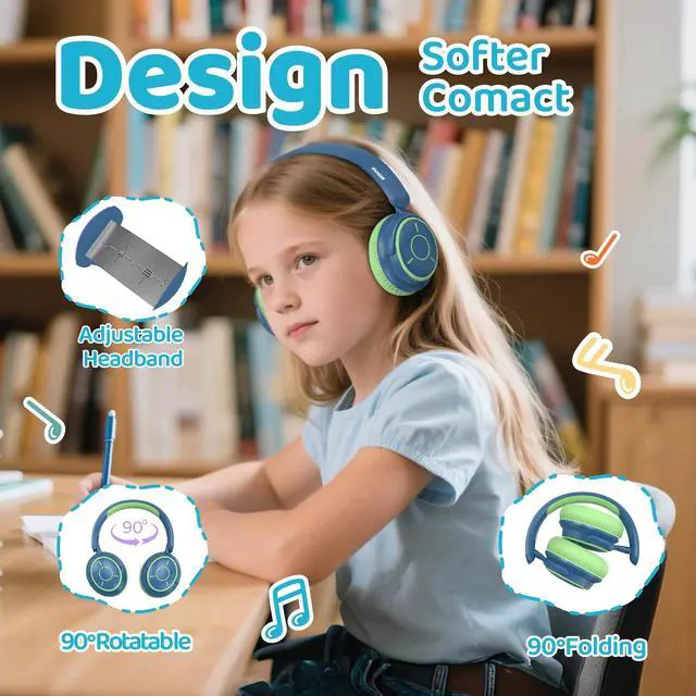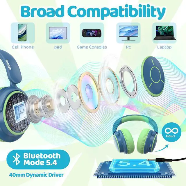 Bluetooth 5.4 HD Sound Quality - Wireless Bluetooth + wired dual connection cater to children's needs: Bluetooth 5.4 ensures a stable connection for online classes and cartoons (uninterrupted connection within 15 meters), and plug-in mode maintains volume limit (exclusive patent). Equipped with a 40mm high-fidelity speaker, online class voice clarity is increased by 50%.