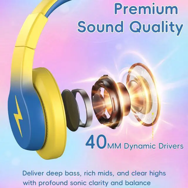 85dB Safe Volume Limiter for Hearing ProtectionThese kids headphones feature a built-in 85dB volume limiter and 40mm premium drivers, ensuring rich, clear stereo sound at a consistently safe volume. This protects childrens delicate hearing during study, entertainment, and travel.