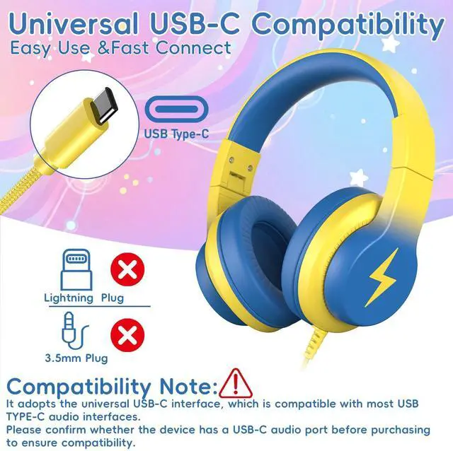 Universal USB-C Plug for Modern DevicesEquipped with a standard USB-C audio plug, these wired kids headphones are compatible with most USB TYPE-C audio interfaces. (Note: For audio transmission only. Please confirm whether the device has a USB-C audio port before purchasing to ensure compatibility. Not compatible with older iPads with Lightning Plug and 3.5mm headphone Plug.)