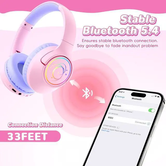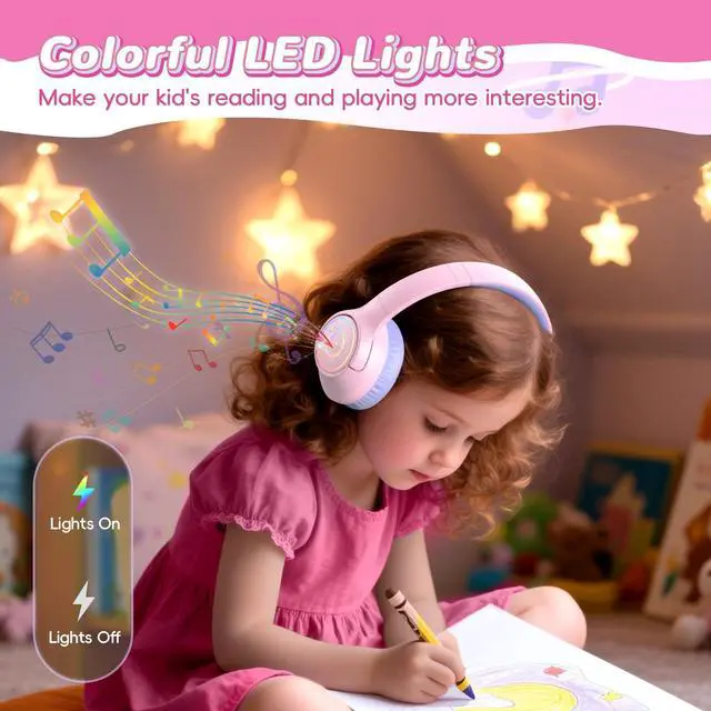 Colorful LED Lights with Effortless ControlLight up your childs music time! These wireless headphones for kids feature vibrant LED lights. Kids can easily switch between modes or turn off the lights in Bluetooth mode to save battery, striking the perfect balance between style and practicality.
