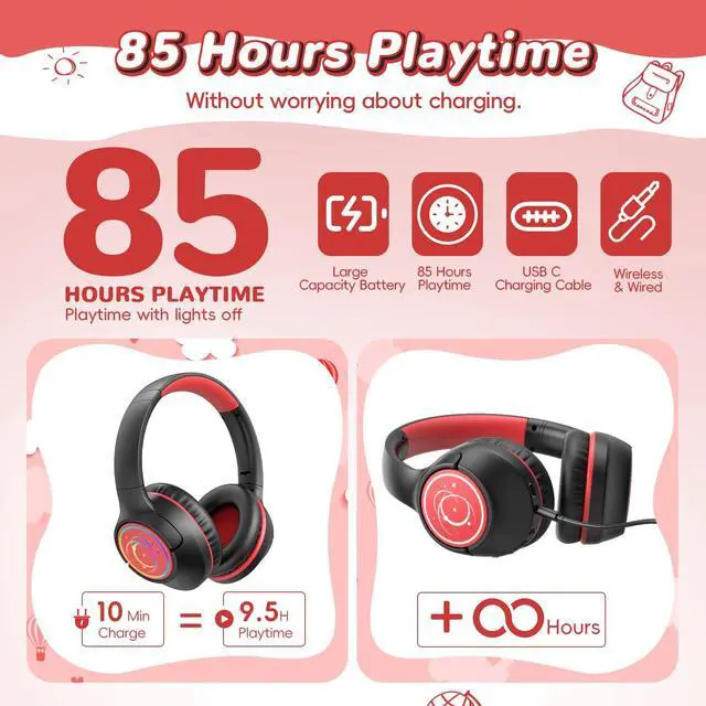 Ultra-Long Battery Life & Fast USB-C ChargingEnjoy up to 85 hours of playtime with lights off on a single charge (about 20 hours of playtime with lights on) with these kids' Bluetooth headphones, or plug in the 3.5mm AUX cable for unlimited use. USB-C fast charging provides 9.5 hours of playtime from just a 10-minute charge.