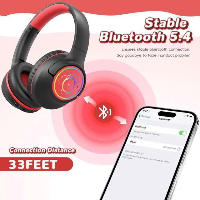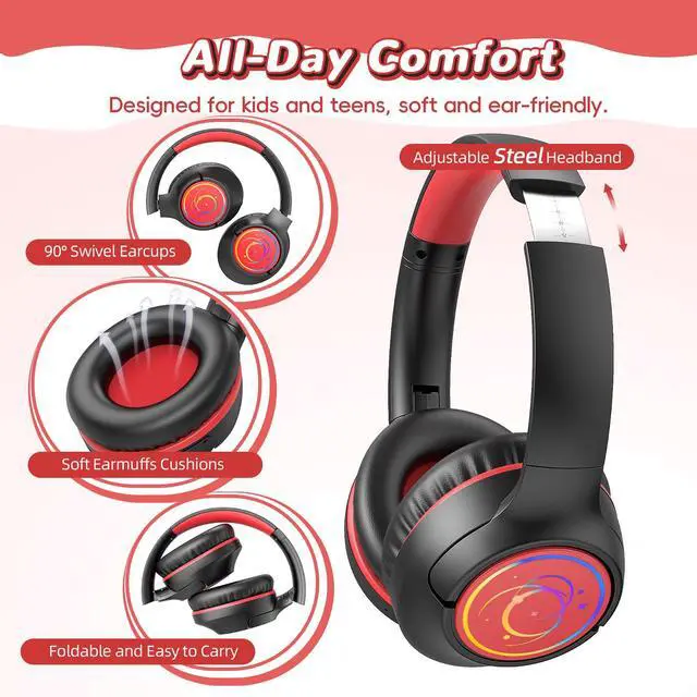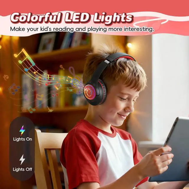 Colorful LED Lights with Effortless ControlLight up your childs music time! These wireless headphones for kids feature vibrant LED lights. Kids can easily switch between modes or turn off the lights in Bluetooth mode to save battery, striking the perfect balance between style and practicality.