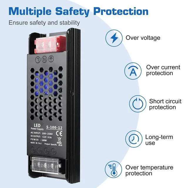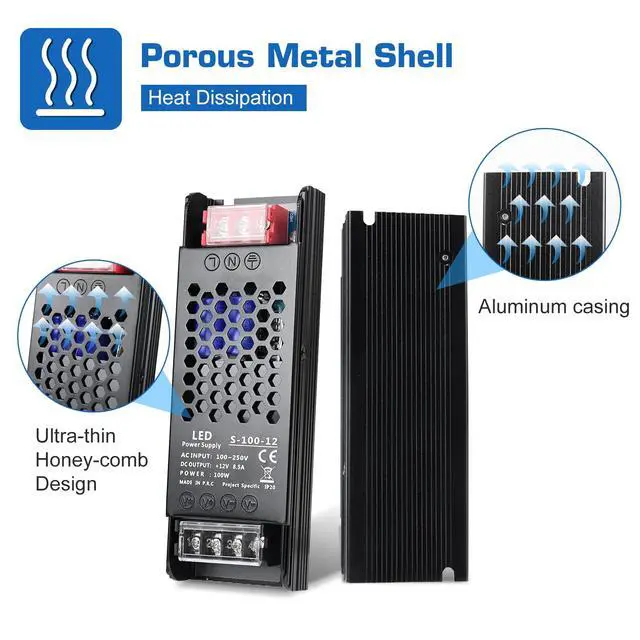 Ultra slim 12V 100W constant voltage power supply with high-quality components. Supports AC 100-250V input and provides stable DC 12V output. Compact design, reliable performance, and ideal for LED lighting and low-voltage devices in homes, offices, and commercial spaces.