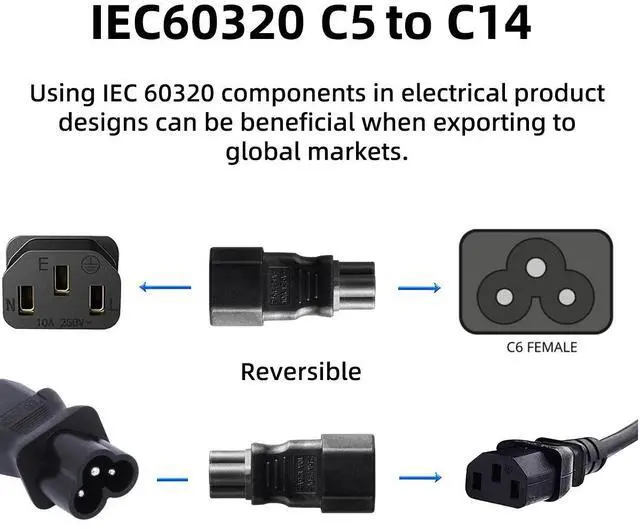 IEC 320 Adapter 3 Poles Socket C14 to Cloverleaf Plug Micky C5 Straight Extension Power Adapter IEC 320 C14 3Pin Male to IEC 320 C5 3Pin female Convert from IEC 60320 C5 Receptacle Rated up to 10A 125V Package: 1pc adapter in the PE bag.