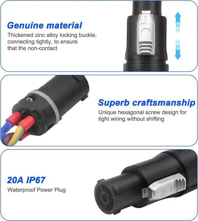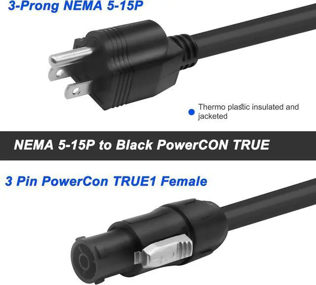 Powercon TRUE1 is a truly lockable waterproof 15A mainline connector suitable for harsh and demanding environments with a blocking capacity (CBC) connector that can be freely connected or disconnected during loading or live performancesPlug and play convenient and reliable. The NEMA 5-15P plugs directly into the socket and Powercon true1 connects the power connector to the appropriate device and then tights the connector to make the cable connection very strong and reliable. This NEMA 5-15P to PowerCon True1 cable applications are generally used in the audio business such as lighting equipment LED stage lighting loudspeakers sound measurement test and control automatic and machine tool industry and medical equipment as a power supply in industrial equipment