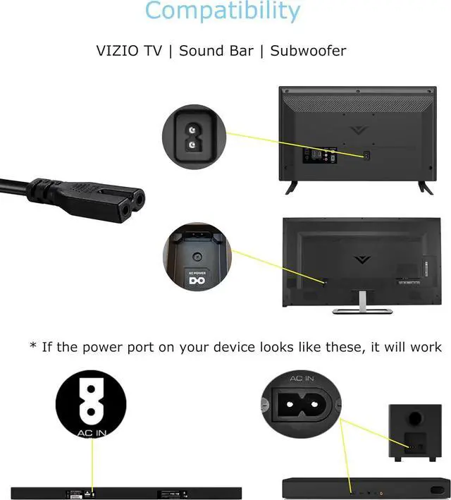 Design / FeaturesHigh Quality 2 Prong Polarized Power Cord / One-Piece Molding Standard Plug Easy to Insert and Pull Smooth and Tightly Combined Not Easy to Fall off Bold Line Tough and Wear ResistantCompatible with Vizio D/E/M Series LED Smart TV (Please Check Connector Photo to Ensure Compatibility); VIZIO Sound Bar Sound Stand S2120W-E0 S4251W-B4B SB3630-E6 SB3821-D6 SB3830-C6M SB3831-D0 SB3851-C0 SB3851-D0 SB4031-D5 SB4051-D5 SB4551-D5Power Cord Type2 Prong Polarized 18 AWG 7A 125VLength6 FeetCertificationUL Listed TONIWA Power Cord are Tested Approved and Certified by UL; Made With High Quality Materials Resistant to Bending and High Temperatures