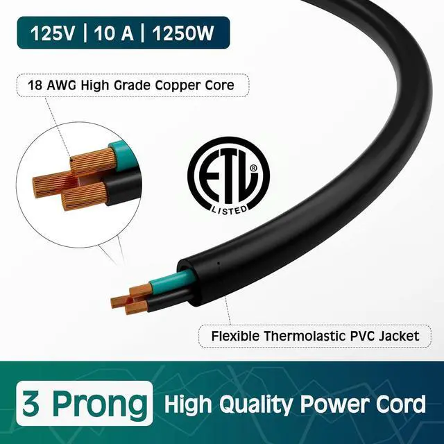 Superior Performance: ETL certified meeting strict safety standards our power cord is made from high-quality materials; featuring a heavy-duty 18 AWG wire with 100% pure copper ensuring reliable and safe power delivery to your devices. The heavy-duty power cord includes a 3-pin shroud Female (IEC320C13) connector on one end and a 3-prong grounded Male plug (NEMA 5-15P) on the other end supporting 125V 10A and 1250W.