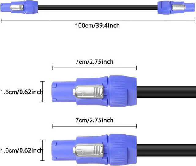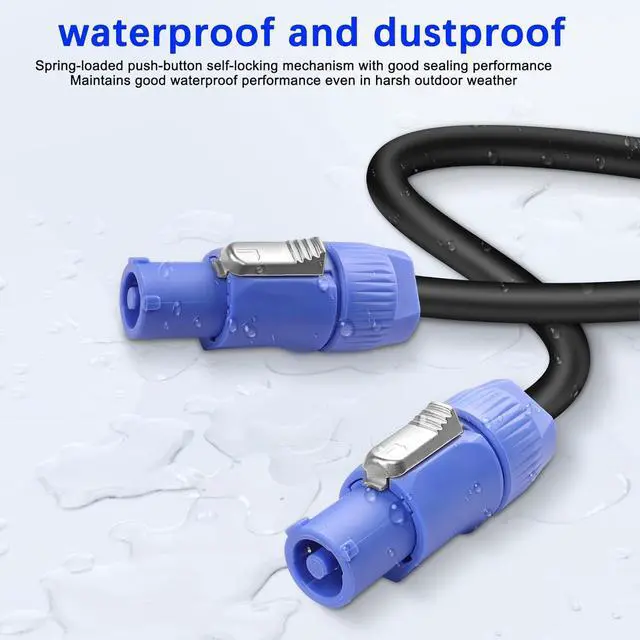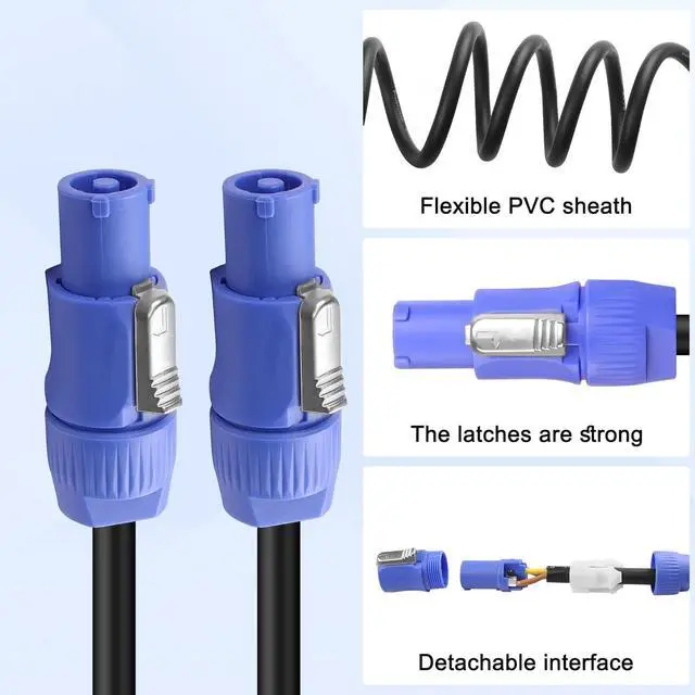 (Note: both connectors are AC powercon input)The body of this 3 pin AC powercon cord is made of professional PVC material for high quality stage lighting equipment with good flexibility. The inner core is made of oxygen-free pure copper low resistance and low heat generation. The connector is made of high-performance engineering plastics nickel-plated contacts stable transmission sensitive contacts high abrasion resistance adaptable to a variety of harsh environments waterproof and dustproof grade up to IP65 to ensure the stability of the current. Lockable 3-core 20A single-phase connector for line neutral and pre-connected safety grounding removable nut interface for easy power failure check at any time. Plug and play convenient and reliable. The powercon input connector uses a simple and reliable twist-lock system to connect the power connector to the corresponding device and then twist and lock the connector so that the cable is connected extremely strong and reliable. This powercon cord is used as a power supply in industrial equipment for audio services such as lighting equipment LED stage lighting loudspeakers sound measurement test and control automatic and machine tool industries and medical devices.