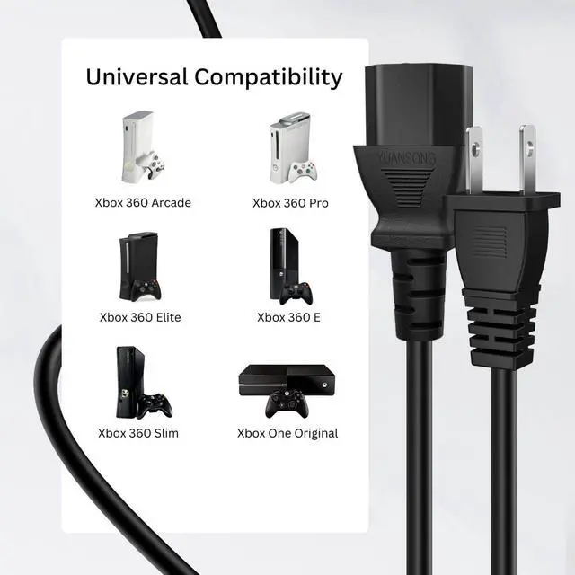 Universal Compatibility: Our two-prong replacement cable for Xbox 360 e power cord adapter is also compatible with Xbox One Original Xbox 360 Slim Xbox 360 E Xbox 360 Elite Xbox 360 Pro Xbox 360 Arcade Xbox 360 Jasper Falcon Model and PS4 Pro (older models CUH-7015 / CUH-7115) compatible with most PC brands (Toshiba IBM Sony Compaq HP NEC AST) NOTE: NOT compatible with PS4 Pro model CUH-7200 Series or Xbox One S / Xbox One X Series Please check the connector before purchaseDurable