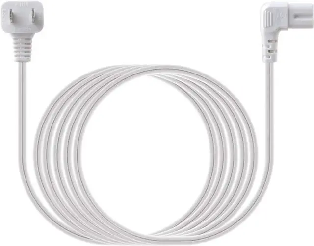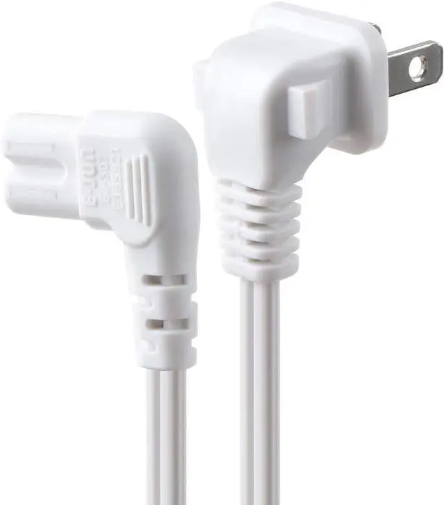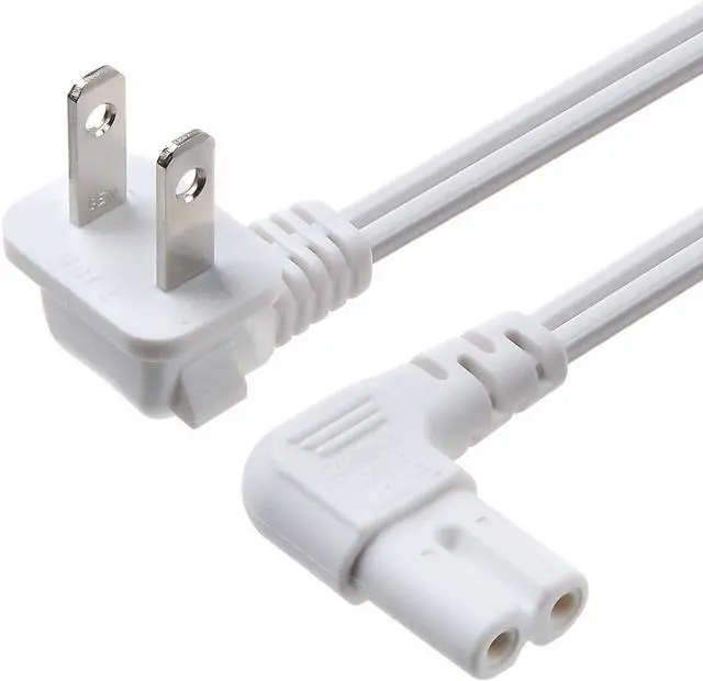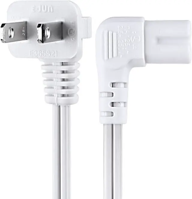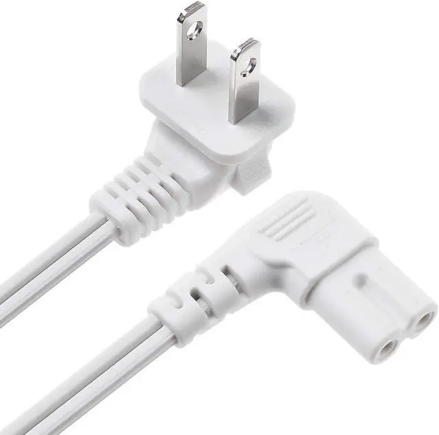 Replacement C7 power cord with 90 degree angle for most models of printer LED TV monitor projector powered speakers laser printer and more that have a removable power cord and use the 2 prong figure 8 shotgun power connector.
