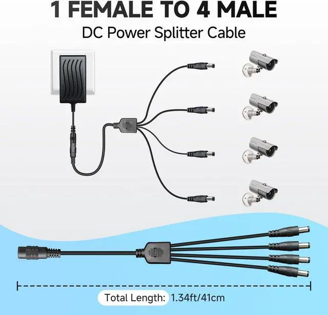 Cord Length: 6 Feet/ 1.8M. UL Listed EMC Approval FCC RoHS Level VI energy efficiency. Adapter comes with 4-way DC power splitter cable which enables you to easily power up to 4 security cameras or devices with one plug. Good for 12V CCTV security cameras/DVR/NVR/HVR (analog AHD IP) BNC cables LED strip lights routers and more. Applicable to any 12V 2A (max) electronics such as monitor LED mirror LED lamp fish tank light IR Illuminator projector BT speaker mini fan humidifier water pump 12V neck/back/foot massager digital photo frame mobile DVD system CD player piano keyboard etc. Package includes 1 x 12V 2amp power Adapter 1 x 4-way power splitter. Lifetime Technical Support. Please kindly double check the plug size before buy. Please contact ANLINK team for bulk order.