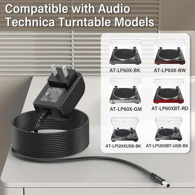 Audio Technica Charger: The replacement charger plug for Audio-Technica turntable is only compatible with Audio Technica AT-LP60X-BK AT-LP60X-BW AT-LP60XBT-RD AT-LP60X-GM AT-LP120XUSB-BK AT-LP120XBT-USB-BK AT-LP60X series AD-SE1220KZ AT-LPW30BKR AT-LPW40WN AT-LPW50PB fully automatic wireless belt-drive stereo turntable record player charging Cord plugs. (Only fit for the model listed. ) Pls make sure your P/ N or model number matches this listingSpecs for