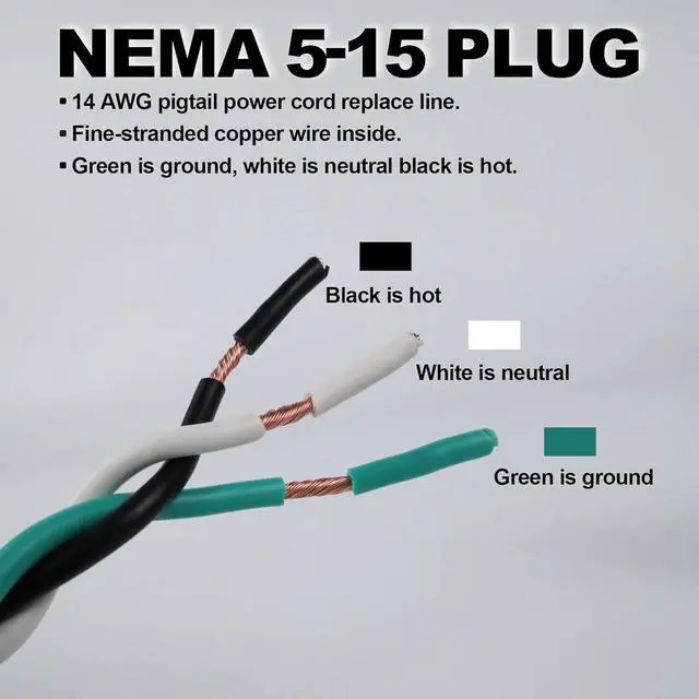 Replacement Power Cord - 14-AWG 3-Wires SJTW 15 Amp 125V 1875 Watts max applications. Pigtail End - 14/3 replacement power cord NEMA 5-15P male to bare end ( ONE END ) which has open wiring on the other end. Safe Cable - UL Listed Insulation stripped for easy connection and installation. 3 prong grounded plug for added safety. Professional safe heavy duty and reliable. Indoor / Outdoor Power Cord -