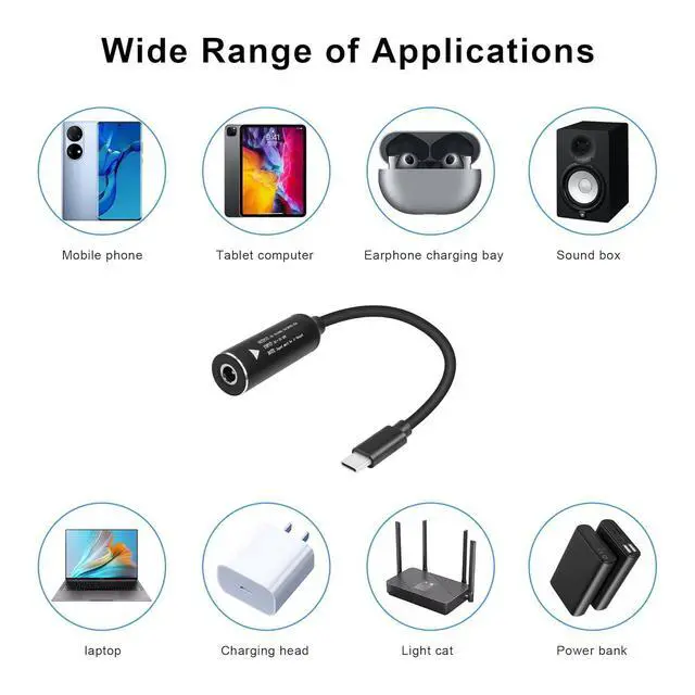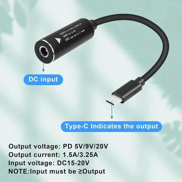 Connector 1: 4.0mmx1.7mm female plug; Connector 2: USB-C male plug; Input voltage: DC15-20V; Output voltage: PD 5V/9V/20V; Output current: 1.5A/3.25A; Cable length: 18cm/7 inches; Maximum power: 65W(Note: input must output)