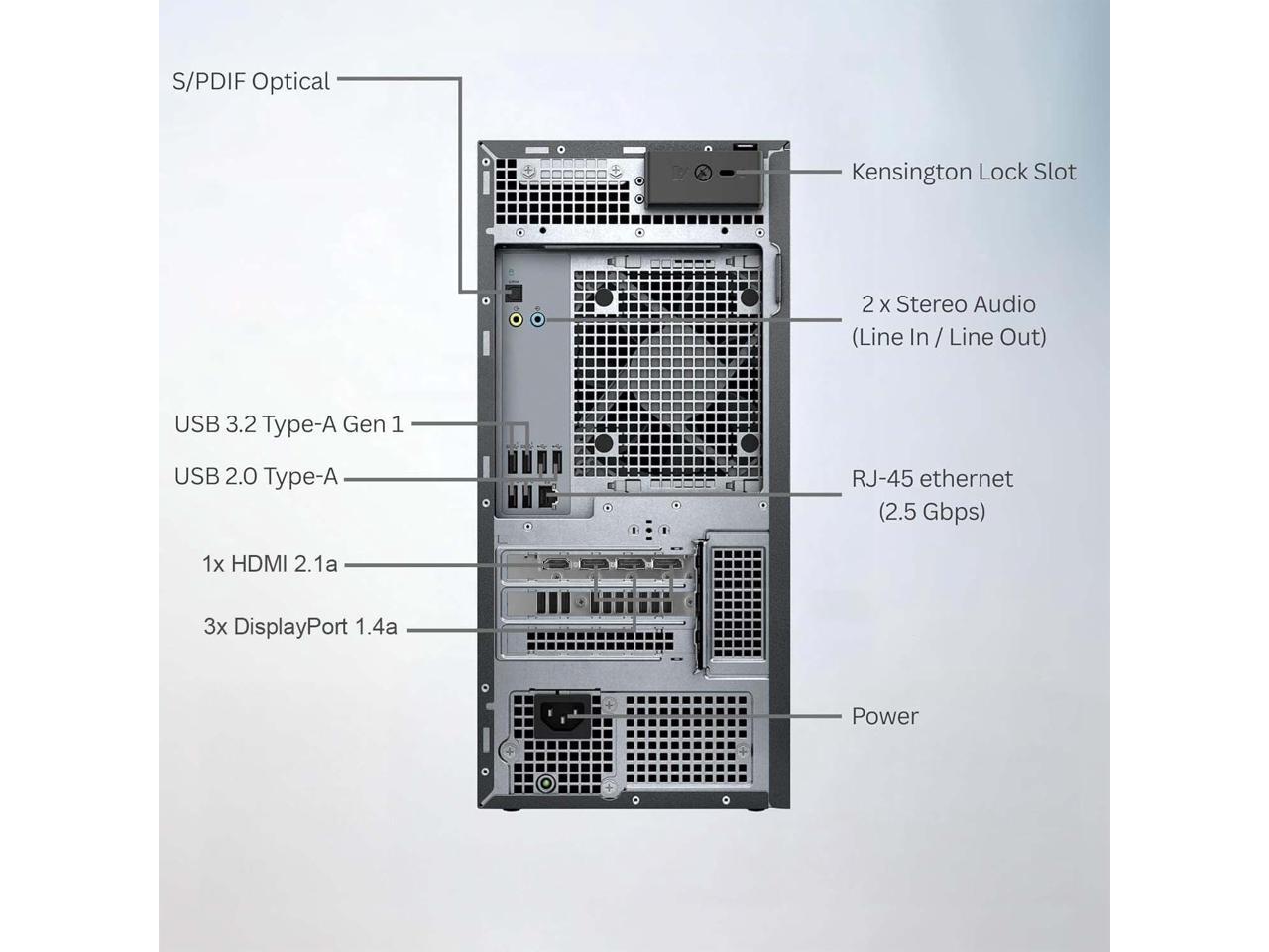 - 3x DisplayPort 1.4a, 1x HDMI 2.1a, 5x USB 3.2 Type-A Gen 1, 4x USB 2.0 Type-A, 1x SD card slot, 1x Headset jack, 2x Stereo Audio