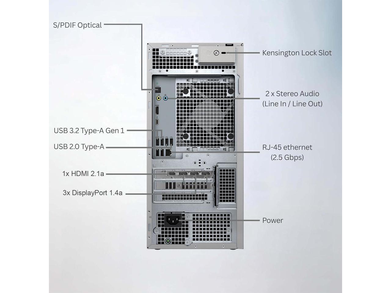 - 3x DisplayPort 1.4a, 1x HDMI 2.1a, 5x USB 3.2 Type-A Gen 1, 4x USB 2.0 Type-A, 1x SD card slot, 1x Headset jack, 2x Stereo Audio