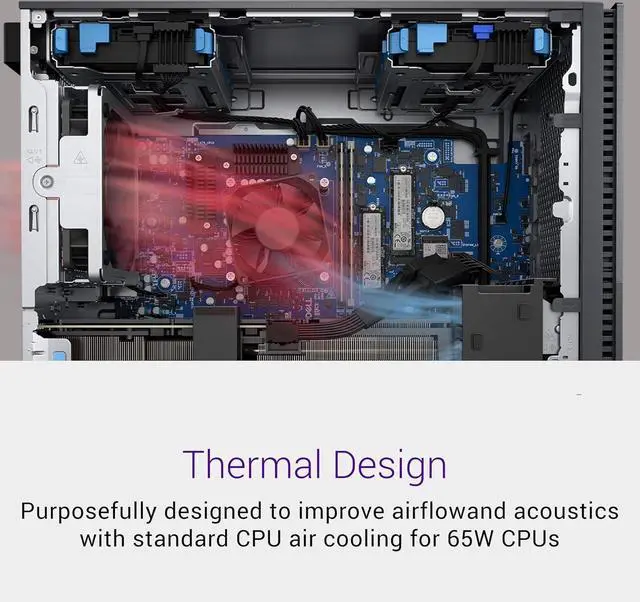 Thermal Design: Purposefully designed to improve airflow and acoustics with standard CPU air cooling for 65W CPUs.