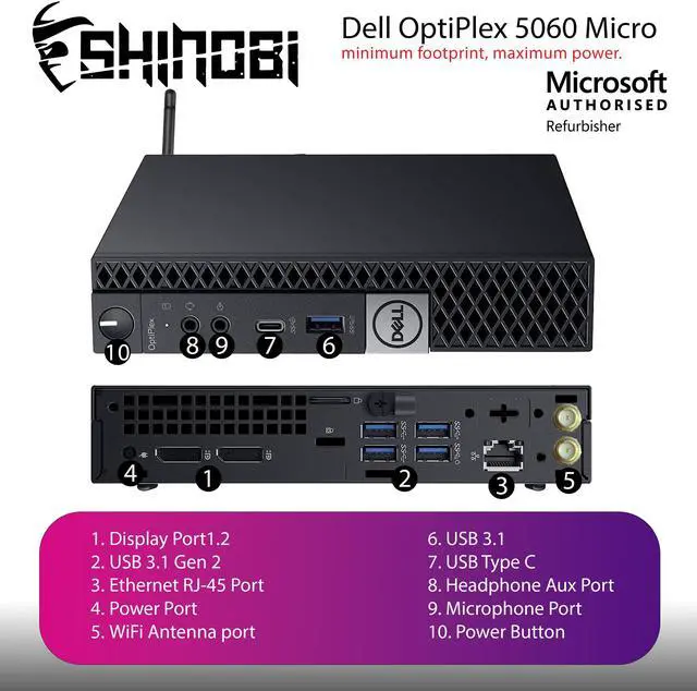 The Dell OptiPlex 5060 Micro is a compact business-class desktop designed for reliable performance and efficient use of space. Powered by an Intel Core i5 8th Gen processor, it is well suited for home offices, front desks, conference rooms, and other tight workspaces.