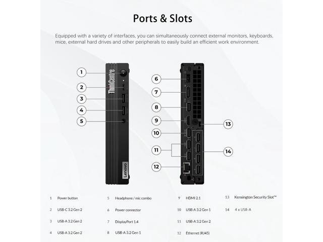 [Quad Display Support] Front: 2 x USB-A 3.2 Gen 2 (1 always on, fast charge), 1 x USB-C 3.2 Gen 2, 1 x Headphone / mic combo, Rear: 2 x USB-A 3.2 Gen 2, 2 x USB-A 3.2 Gen 1, 4 x USB-A, 1 x HDMI 2.1, 1 x DisplayPort 1.4, 1 x Ethernet (RJ45, 1GB), 1 x Kensington Security Slot.