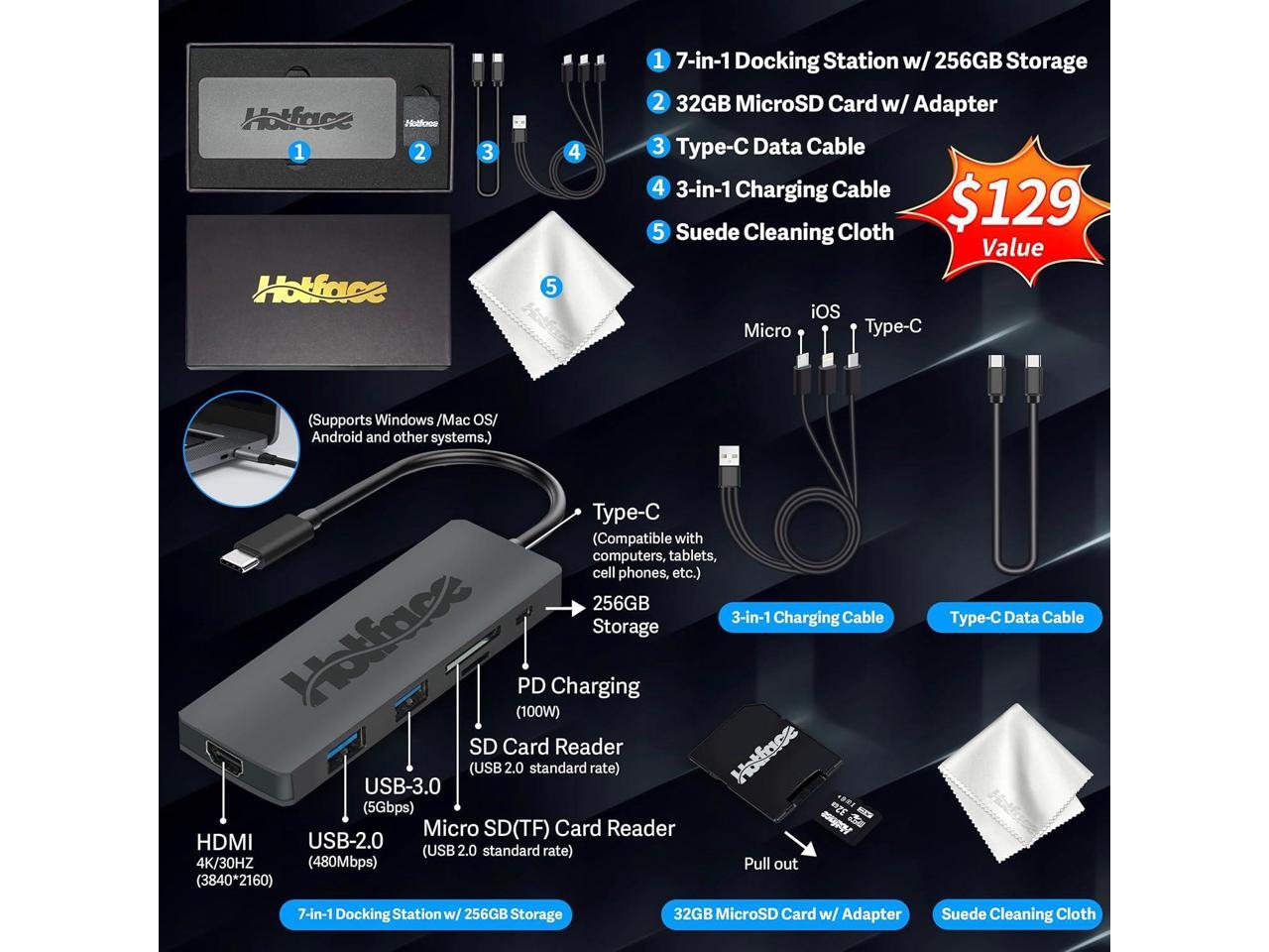 - Bonus Docking Station Set: 1x 7-in-1 Docking Station with 256GB Storage, 1x 32GB MicroSD Card with Adapter, 1x Type-C Data Cable, 1x 3-in-1 Charging Cable, 1x Suede Cleaning Cloth.