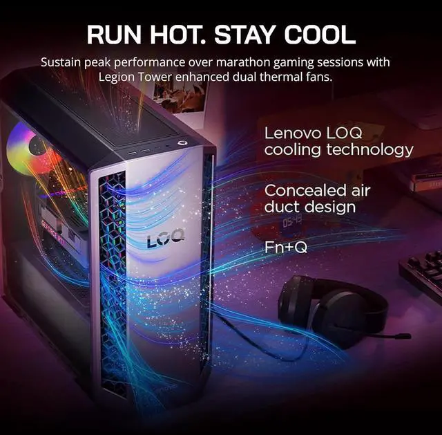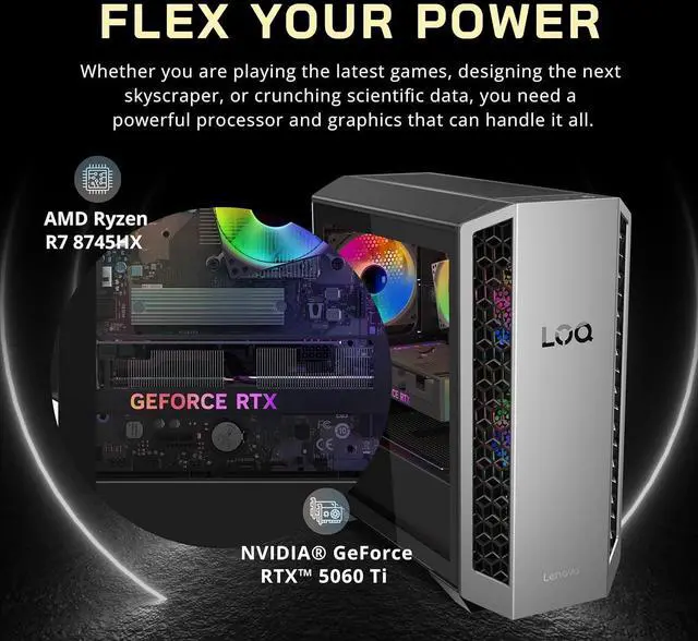 The Lenovo LOQ Tower Gaming Desktop delivers powerful gaming performance with an AMD Ryzen 7 8745HX processor, RTX 5060 Ti graphics, immersive audio, and ARGB cooling.