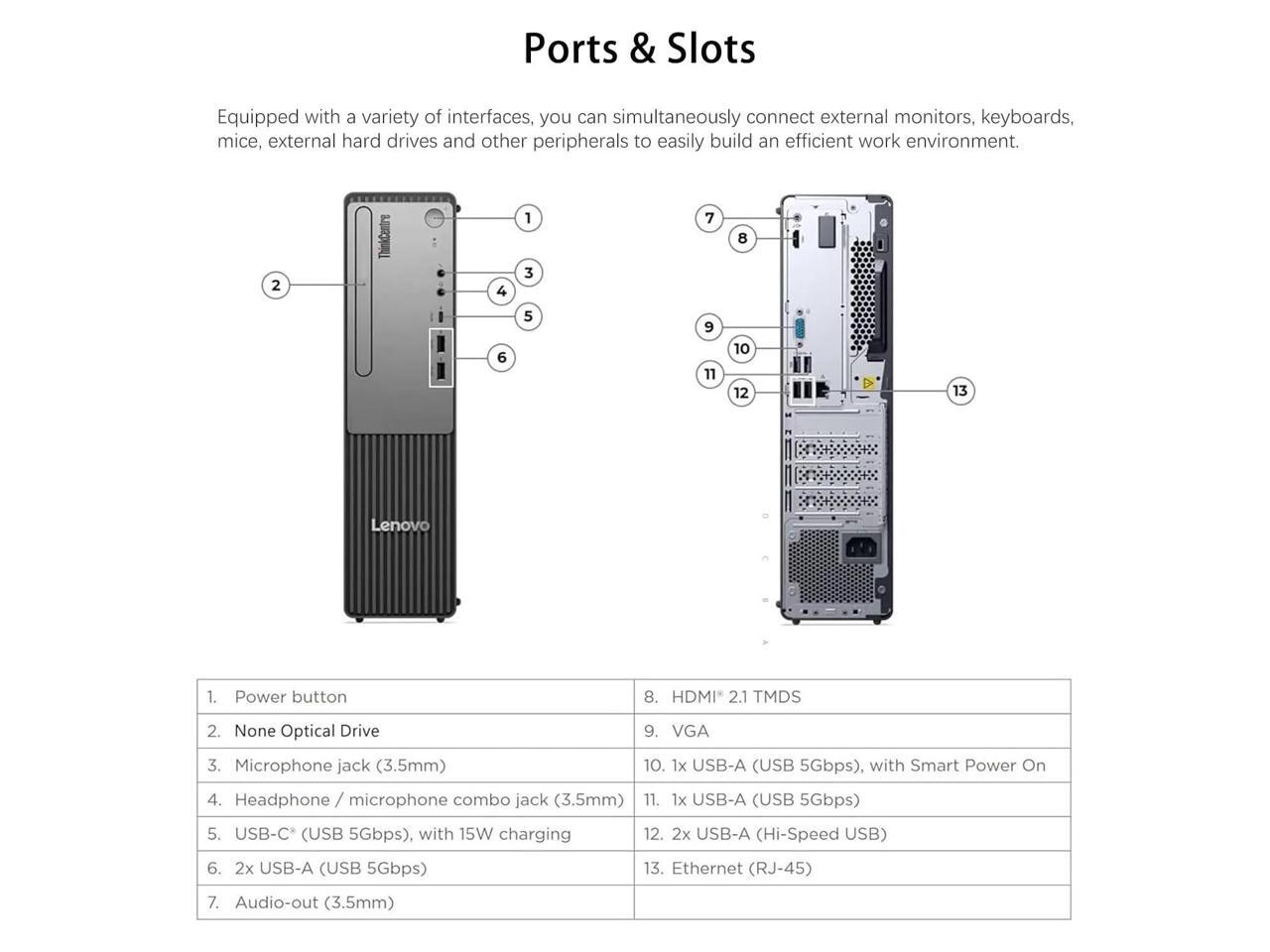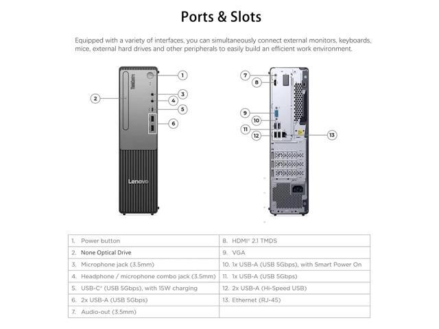 - [Quad Display Support]ront: 1x USB-C (USB 5Gbps), with 15W charging, 2x USB-A (USB 5Gbps), 1x headphone / microphone combo jack, 1x microphone , Rear Ports, 2x USB-A (Hi-Speed USB / USB 2.0), 2x USB-A (USB 5Gbps / USB 3.2 Gen 1), 1x HDMI , 1x VGA, 1x Ethernet (RJ-45), 1x line-out (3.5mm).