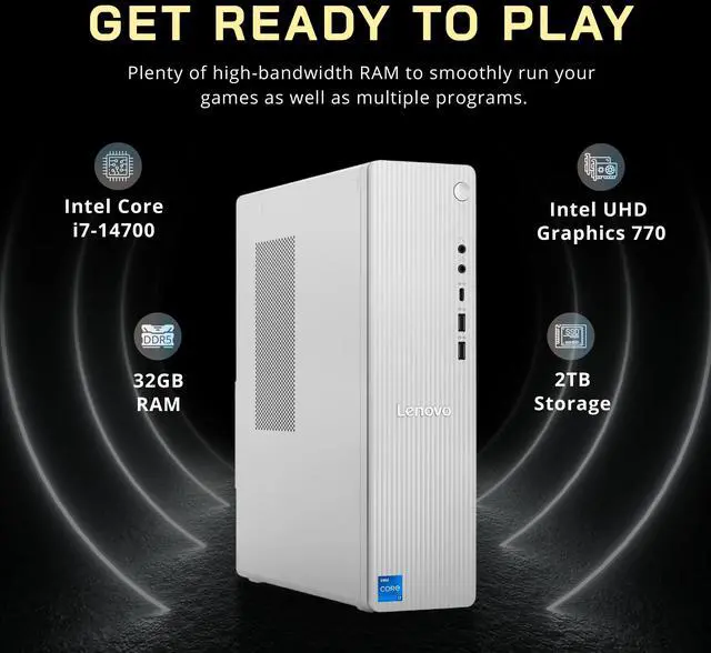 The Lenovo IdeaCentre Tower Desktop delivers fast, efficient performance with the Intel Core i7-14700 processor and smooth, reliable visuals with Intel UHD Graphics 770, making it ideal for multitasking, productivity, and everyday computing.