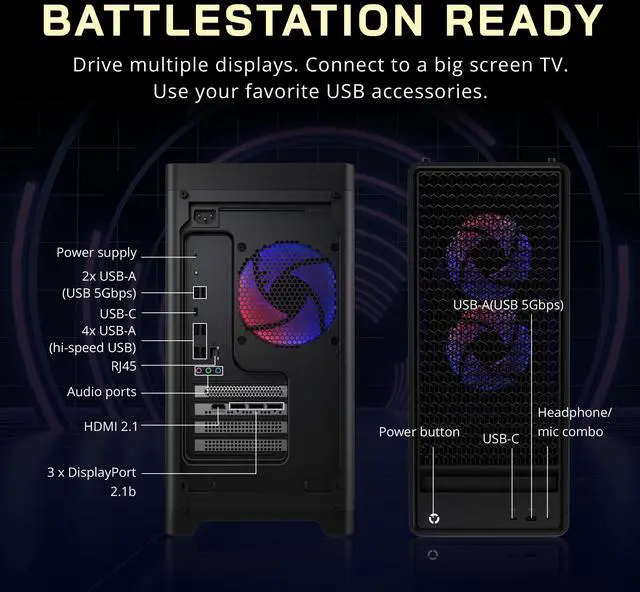 Windows 11 Pro: 19.3" x 16.29" x 8.3", 33.06 lbs. Ports: Top: 1x USB-C (USB 5Gbps/ USB 3.2 Gen 1), 1x USB-A (USB 5Gbps/ USB 3.2 Gen 1), 1x headphone/ microphone combo jack (3.5mm); Rear: 1x USB-C (USB 10Gbps/ USB 3.2 Gen 2), 2x USB-A (USB 5Gbps/ USB 3.2 Gen 1), 4x USB-A (Hi-Speed USB/ USB 2.0), 1x RJ-45, 1x power connector, 3x audio out (5.1 channel). Wi-Fi 6E + Bluetooth 5.3.
