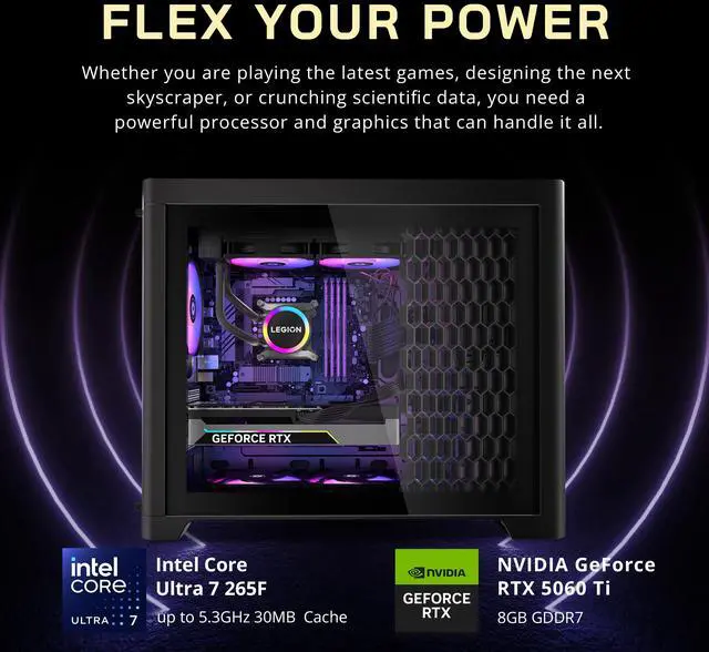 The Lenovo Legion Tower 5i Gaming Desktop delivers high-performance gaming and multitasking with its Intel Core Ultra 7 265F processor and NVIDIA GeForce RTX 5060 Ti graphics.
