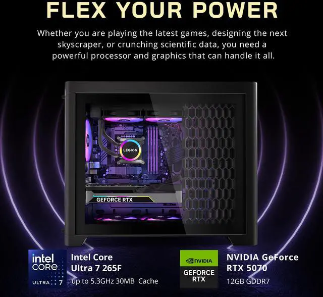 The Lenovo Legion Tower 5i Gaming Desktop features an Intel Core Ultra 7 265F processor and NVIDIA GeForce RTX 5070 graphics for high-performance gaming and smooth visuals, plus Wi-Fi 6E for fast, reliable connectivity.