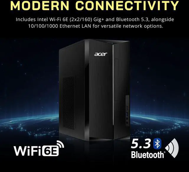 The Acer Aspire Desktop combines the Intel Core i5-14400 processor for strong multitasking performance, Intel UHD Graphics 730 for smooth 4K visuals, and a reliable keyboard and mouse for a complete, ready-to-use setup.