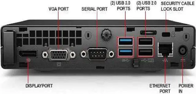 • 2 USB in Front, 4 USB in the Back, Headset Port, Microphone Port, 1 Gigabit Network Port, 1 VGA Port, 1 Display Port, 1 HDMI.