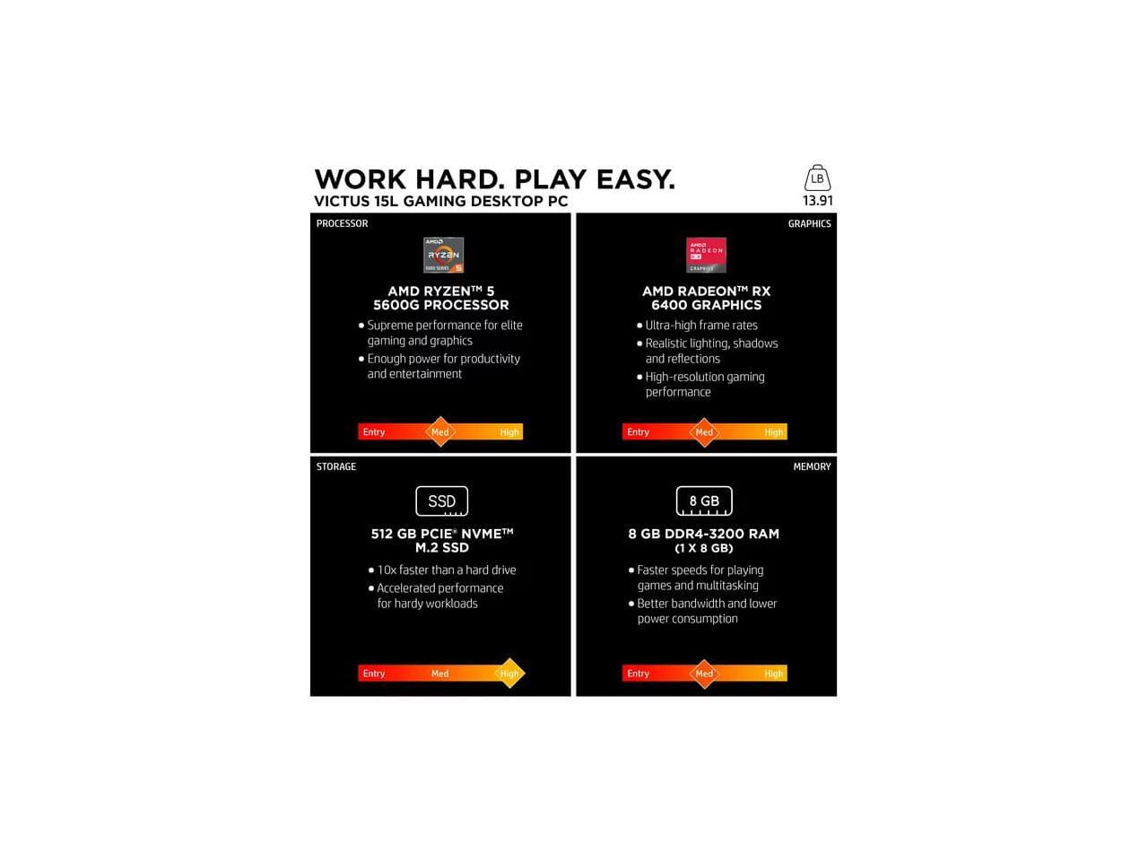 Say hello to the Victus Desktop Gaming PC, everything you need to play. Play for real with AMD Radeon RX graphics, Bluetooth Wi-Fi enabled, DDR4 memory and a PCIe NVMe SSD. Featuring 9 USB ports, ample storage, and a freshly designed case with RGB lighting on the front panel. Its a mean, lean gaming machine.