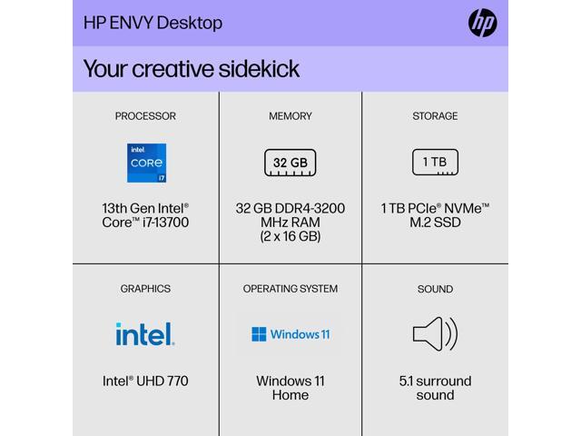 HP Envy Desktop PC, 13th Generation Intel Core i7-13700, 32 GB RAM, 1 TB SSD, Intel UHD Graphics 770, Windows 11 Home, TE01-4020 (2023)