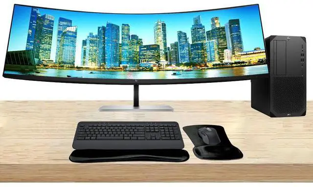 HP Workstation Bundle Z2 G9 Tower i7, 16GB RAM, 512GB SSD, Windows 11 Pro, EliteDisplay E45c G5 45 Curved DQHD Monitor, and MK650 Wireless Keyboard & Mouse with Gel Pad