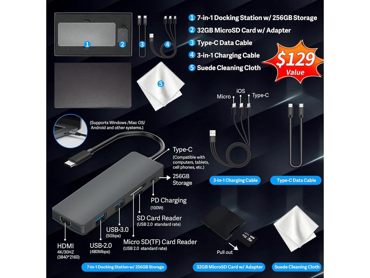 - Bonus Docking Station Set1x 7-in-1 Docking Station w/ 256GB SSD, 1x 32GB MicroSD Card w/ Adapter, 1x Type-C Data Cable, 1x 3-in-1 Charging Cable, 1x Suede Cleaning Cloth.