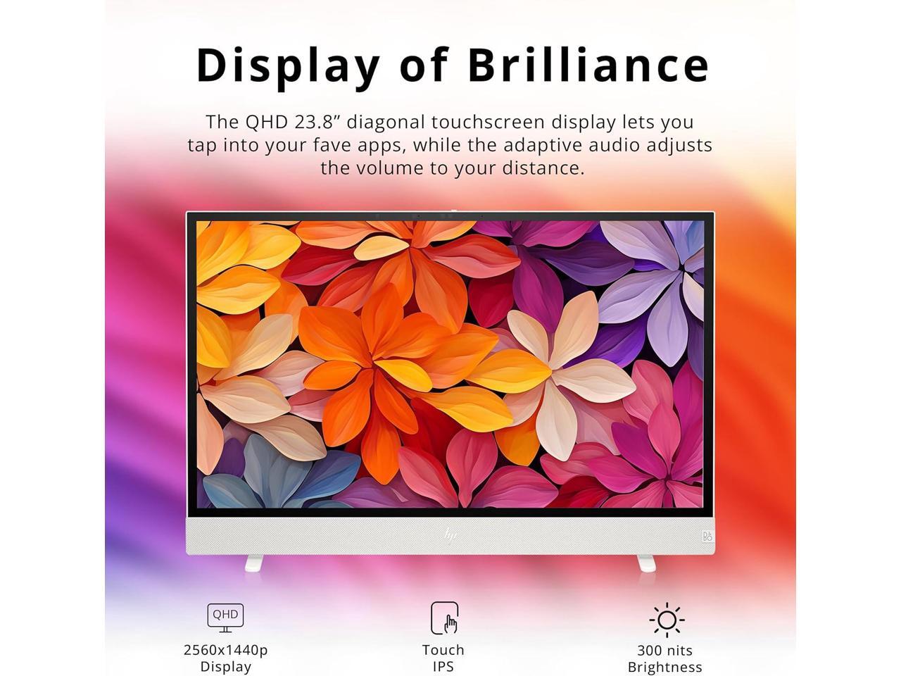 - 23.8" QHD Touchscreen display23.8" diagonal, QHD (2560 x 1440), touch, IPS, three-sided micro-edge, BrightView, Low Blue Light, 300 nits, 99% sRGB display.