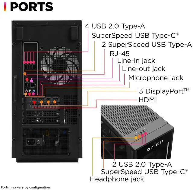Port: 1× USB Type-C 10Gbps (HP Sleep and Charge), 2× USB Type-A 5Gbps (HP Sleep and Charge), 1× headphone/microphone combo, 1× HDMI 2.1 b, 3× DisplayPort 2.1 b, 1× RJ-45 Gigabit Ethernet, 1× PCIe x16, 1× PCIe x4, 3× M. 2 (2 for SSD, 1 for WLAN)