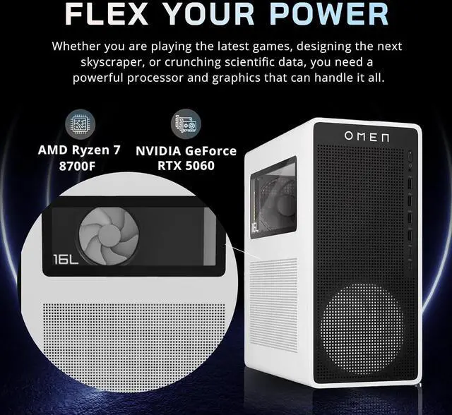 The HP Omen 16L Gaming Desktop delivers powerful performance with the AMD Ryzen 7 8700F and NVIDIA GeForce RTX 5060 8GB GDDR7, offering smooth, immersive gaming, complete with a keyboard and mouse.
