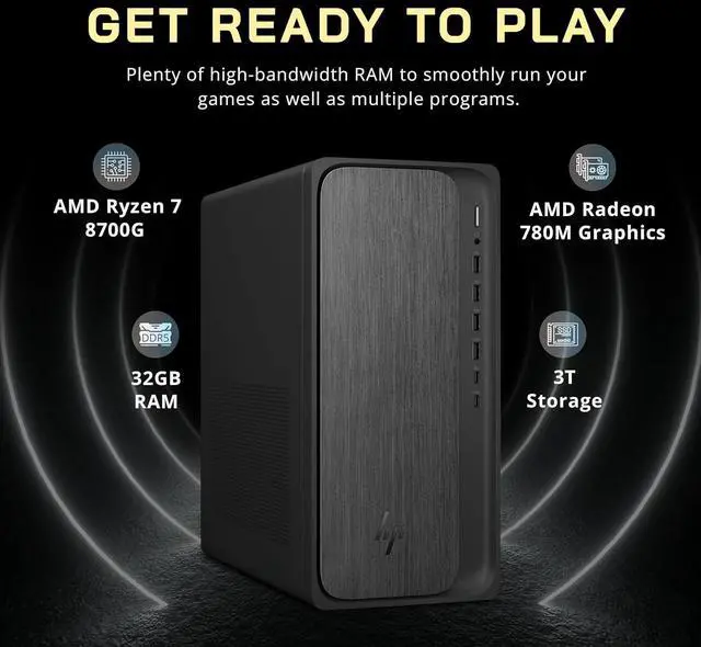 The HP OmniDesk Desktop Computer PC delivers powerful performance with the AMD Ryzen 7 8700G processor, stunning visuals via AMD Radeon 780M Graphics, and enhanced productivity with Copilot, complete with a keyboard and mouse for immediate use.